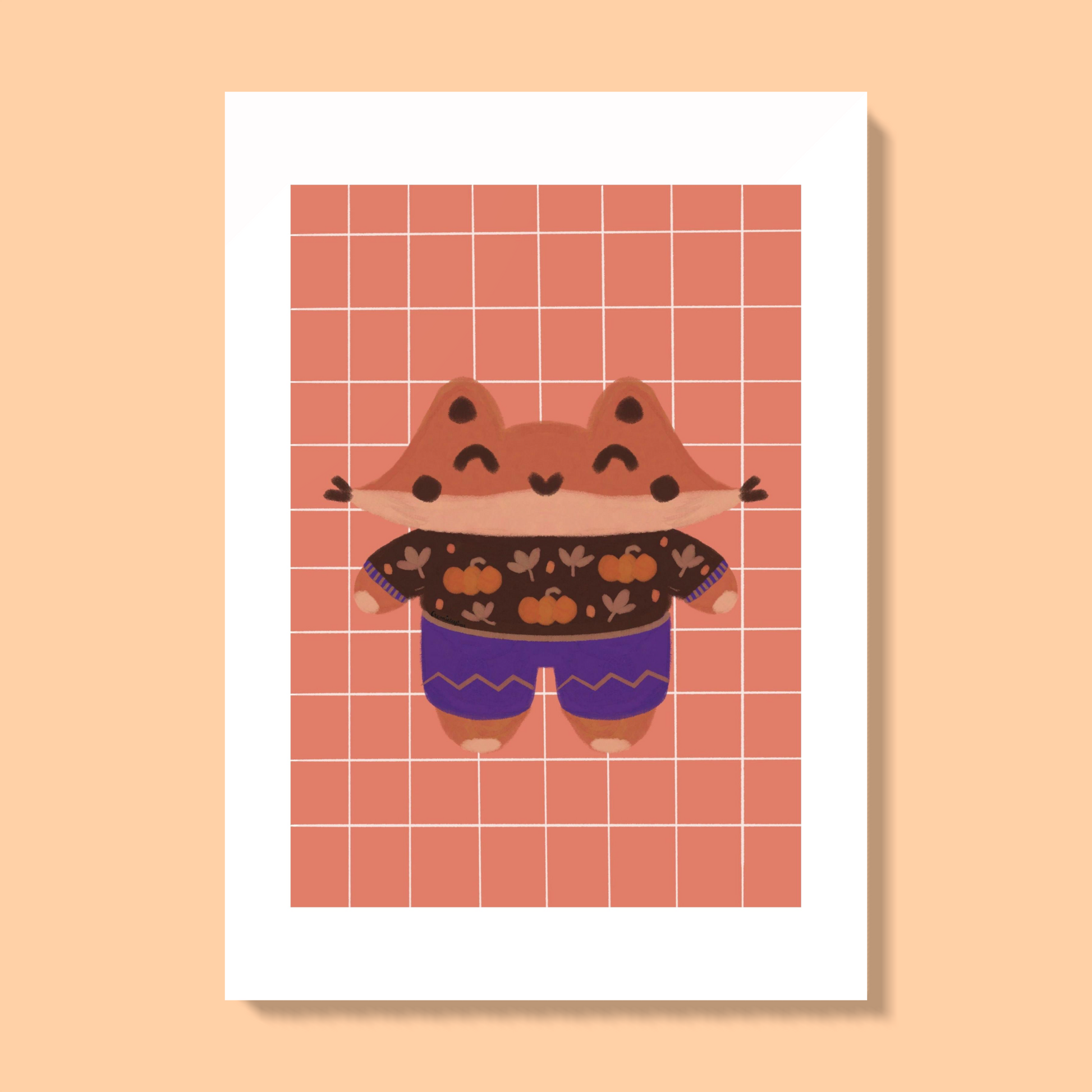 Mochi le renard est fier de porter son pull motif citrouilles !